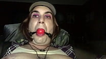 Sissy Stacey Sinmore está vestida de travesti, amordazada y con un vibrador de 25 cm por todo el culo 69 seg