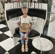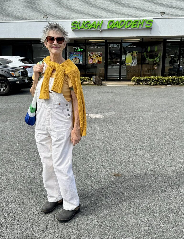 Sitting in my new yellow pants in a very big chair at the International Marketplace in Waikiki